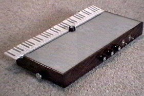 Like the Tannerin, this one produces a sine wave. Unlike the Tannerin, which uses a mechanical linkage to control a pitch potentiometer, this Trautonium uses a brass tube pressed against a long wirewound resistor to change pitch. The resistor is barely evident as a black line along the top front edge of the instrument. |