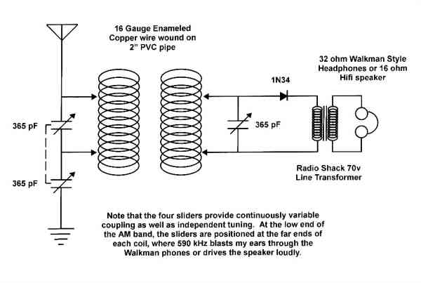I don't sell plans or instructions for this radio. I built it a while back, and just about everything I know about it is featured on this web page. If you want to build a radio like this, please read the text carefully. If you have a hard time figuring out how to build yours from what is provided here, a crystal radio kit (available elsewhere) is probably a better choice for you. Although this page is not intended to be used as a set of plans, it will have to suffice for do-it-yourselfers. As an alternative, you might try building another type where I do provide instructions.