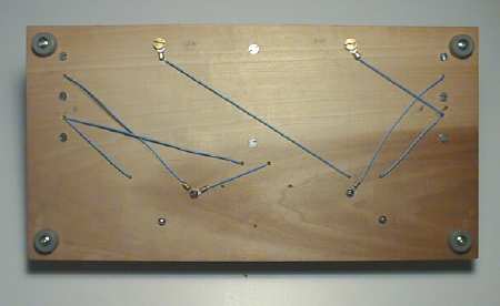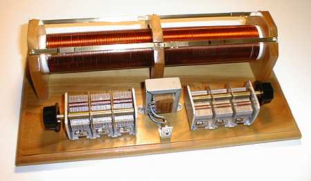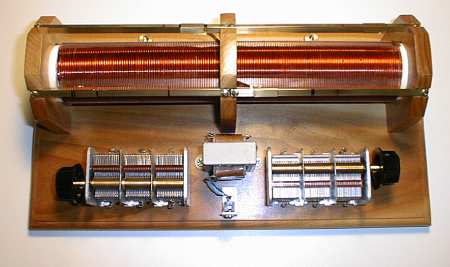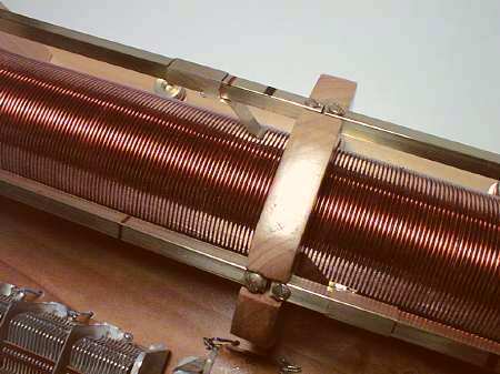 The wires to the slider bars run down internally through the wood supports. All other wiring is on the underside of the wood base. Wire emerges through small holes on the back sides of the variable capacitors and transformer. |