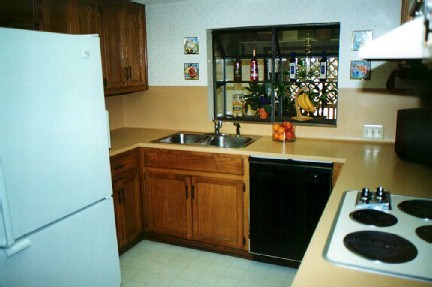 Refrigerator magnets, breadmaker, cutting board, dishes, windowbox clutter | De-cluttered, clean & shiny now, dynamized by colorful fresh fruit |