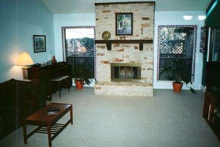 Too much clutter and personal objects; extra furniture creates bulk and destroys the aesthetic unity of the room | De-personalized (portrait over mantle changed), dynamized (plants added, generic arty objects on mantle, lamp adds warmth) |