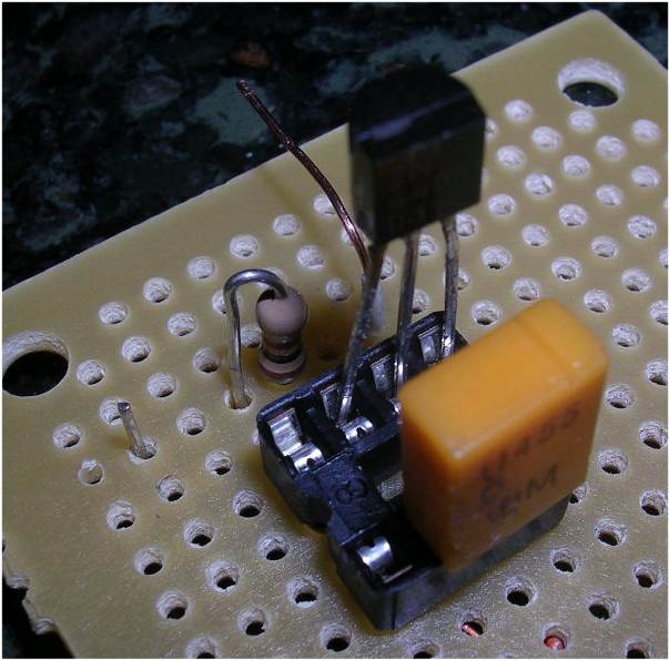 Output is taken off the emitter. The resonant device is a three terminal 455 KHz ceramic filter typically found in consumer radios. The input and output of the ceramic filter are tied together. The filter's center terminal (normally grounded) is connected to the current limiting resistor.
