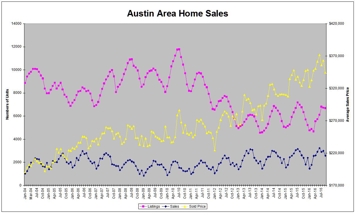 Want to see supply and demand at work? On the following chart, note the dramatic increase in sold prices and the decrease in inventory during 2005 and 2006. Prices remained stable during the doldrums from 2007-2009. You can see the economy kicking back in in 2012 with a stunning drop in inventory contrasting with the resulting increase in average price. In 2001, after ten years of strong appreciation, Austin's housing market so heavily favored sellers that buyers felt they had to jump on the next acceptable property that came on the market. Buyers worried they'd be priced out of the market. Then from 2001 to 2003, as in many fine cities, Austin homesellers found themselves confronted with four economic realities that affected home sales: