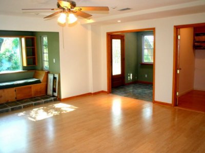 Ample storage under window seat Pretty view of shady , private front yard This room is BIG , for easy furniture placement