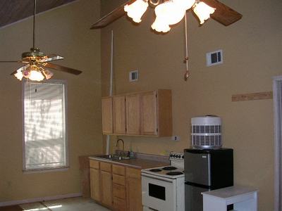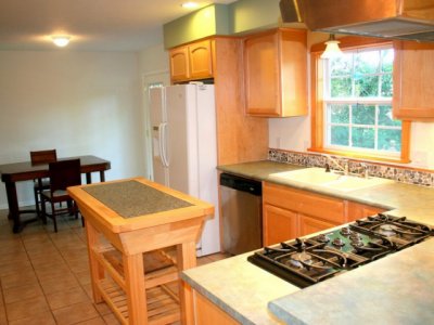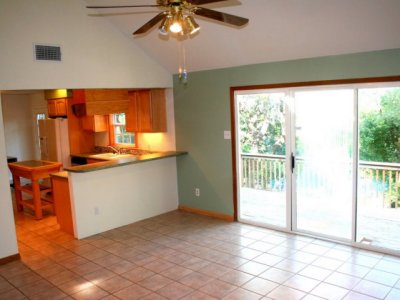 and counter space Refreshing view of back yard, deck , and pool Accent lighting completes the wonderful feel Kitchen has large breakfast area at opposite end |