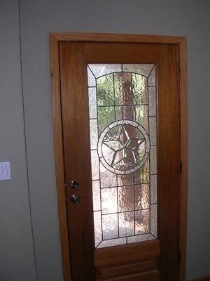 Custom cut glass door Private little office just off entry at right Living room at left |