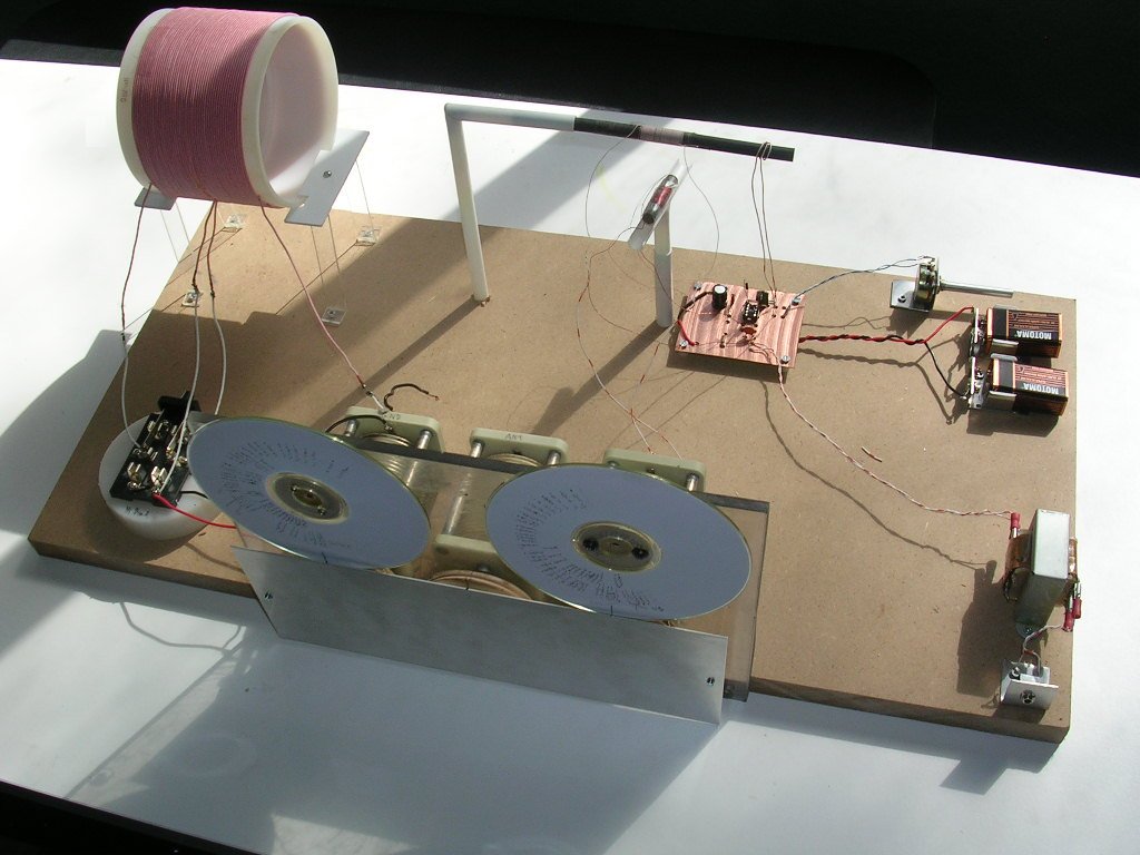 Antenna coil is contrawound 660/46 Litz on 4.5" dia styrene form. Tank coil is on 6" ferrite rod.