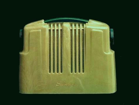 I decided to get this one because I am attracted to rich green plastic, especially when it is marbleized. This is one of the few early plastic radios that made use of plastic's plastic properties: The case is poured in one piece, as opposed to having doors for batteries or repair access. The whole chassis slides out from the bottom. Fifty