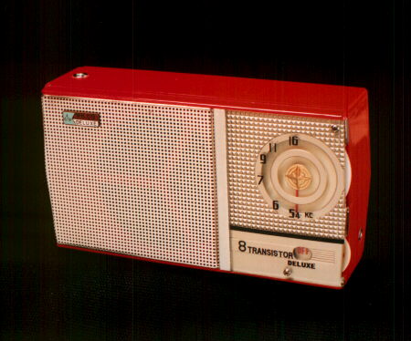 Until now, I never heard of Wilco manufacturing. Yet this radio is one of my absolute favorites. Excellent styling and fine construction. The plastic is as rich as it gets. The dotted area behind the tuning dial is tiny 3-D gold reverse painted pyramids, over which have been applied as thick a clear coat as I have ever seen. The volume indicator, shown with "OFF" in the window, displays a series of increasingly bigger red dots corresponding with the volume. The top and side, respectively, show antenna and earphone jacks. |